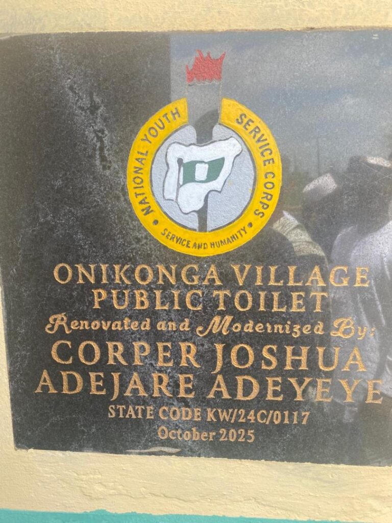 A newly renovated four-block toilet and shower facility was commissioned on Monday, October 27, 2025, in Onikanga Village, Ilorin South, by Corps Member Adeyeye Adejare Joshua, popularly known as Ceejay, who served with Flow FM 92.7 as his Place of Primary Assignment (PPA).